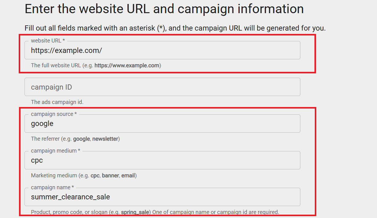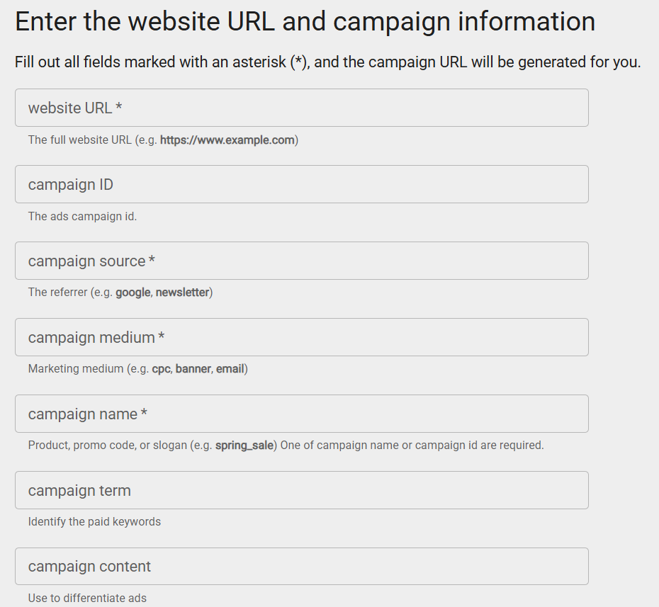 キャンペーンURLを作成する際は、主に以下の項目を設定する必要があります。設定が必須の項目には、「*(アスタリスク)」が付いているので覚えておきましょう。