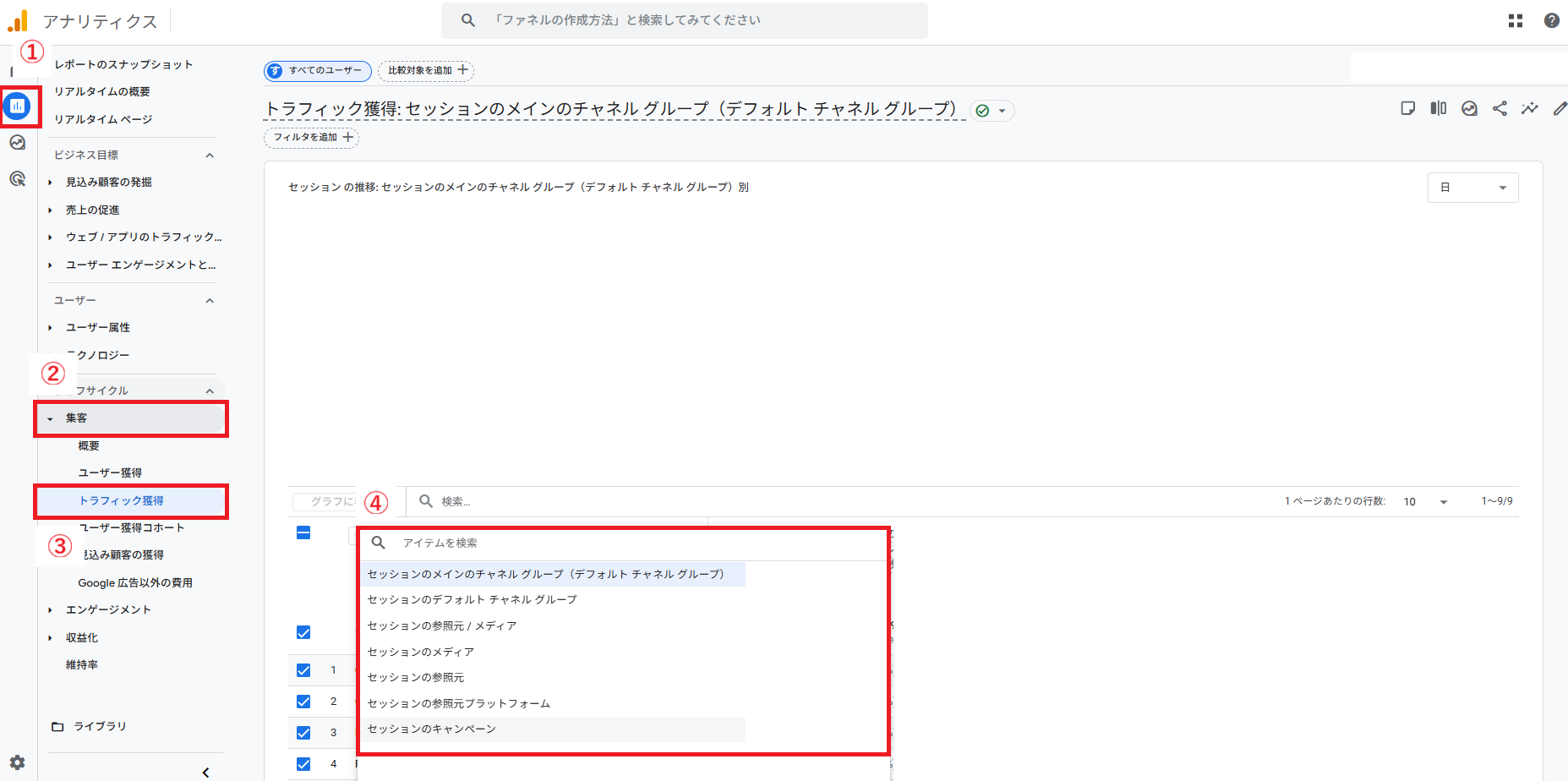 - 「トラフィック獲得」レポートを開く