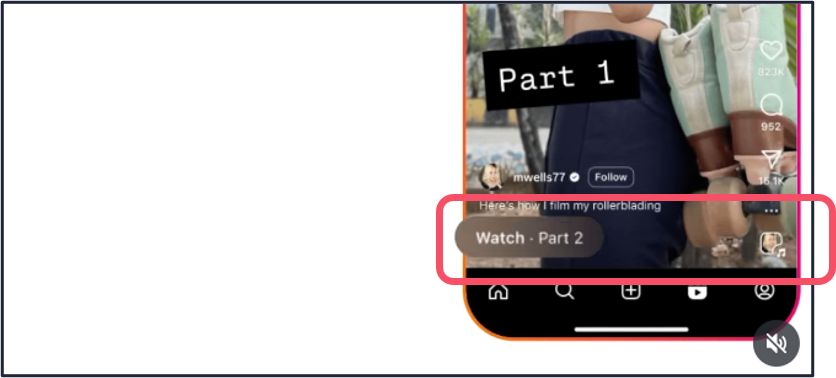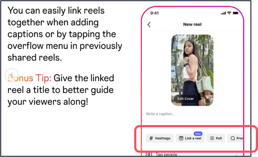 投稿したリールのキャプション部分にリンクボタンが表示され、関連性のあるリール動画をリンクすることでユーザーのアカウント回遊を促せます。