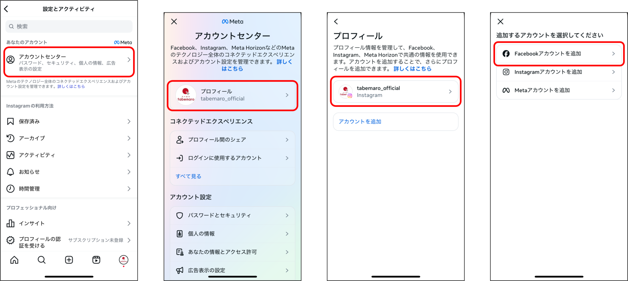 プロフィール画面の右上にある三本線のメニューアイコンから「設定とアクティビティ」に移動し、「アカウントセンター」をタップします。