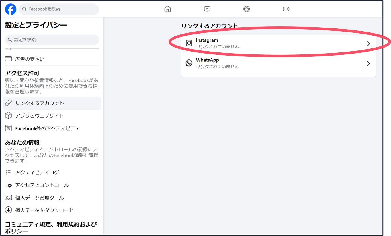 次に、「アクセス許可」セクションから「リンクするアカウント」を選択し、「Instagram」オプションをクリックします。