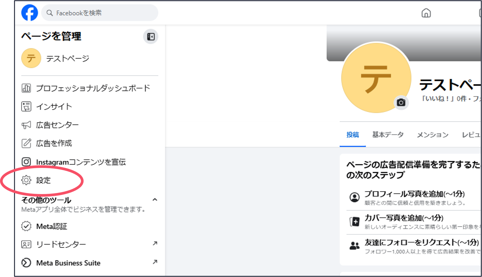 まず、Facebookページにログインし、サイドバーの「設定」をクリックします。