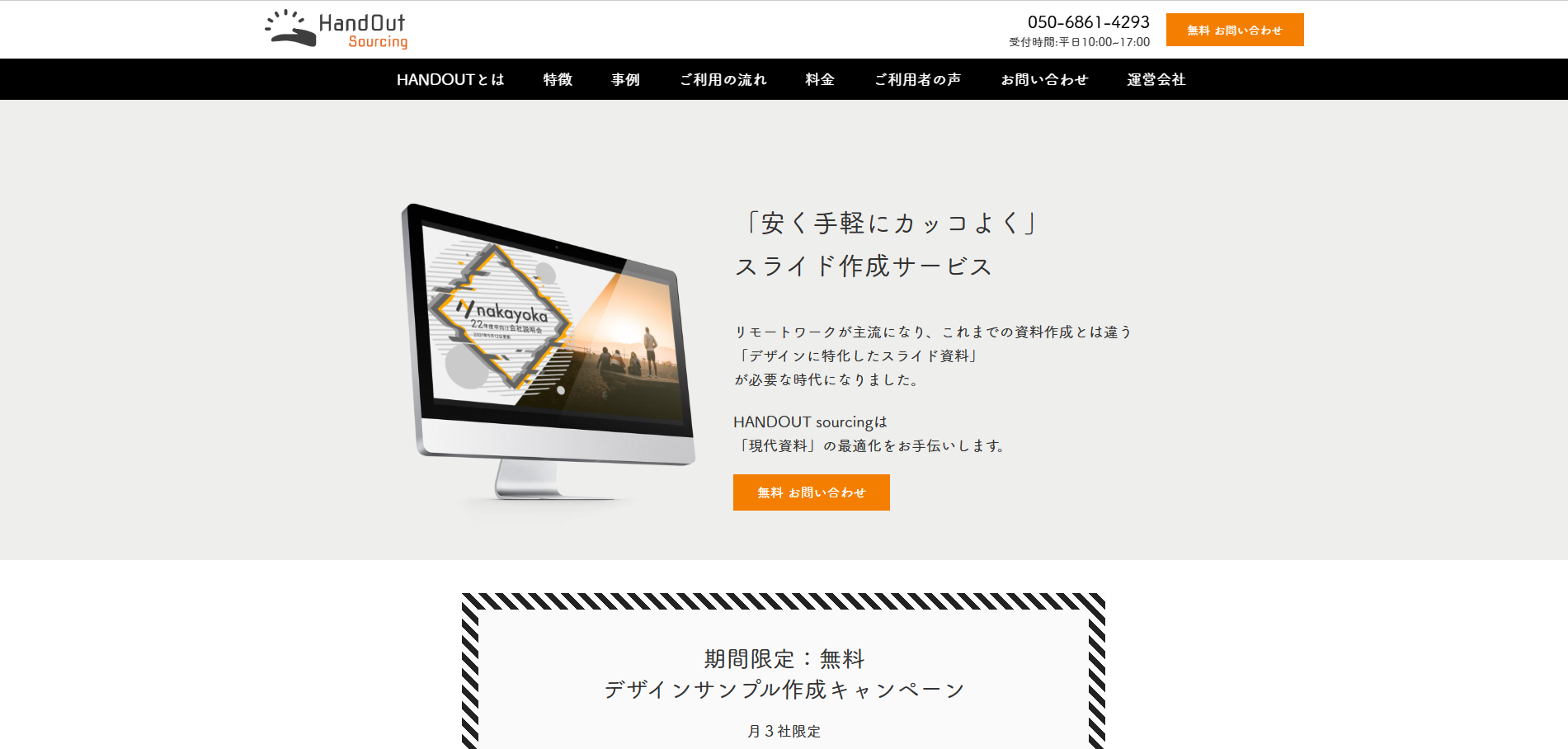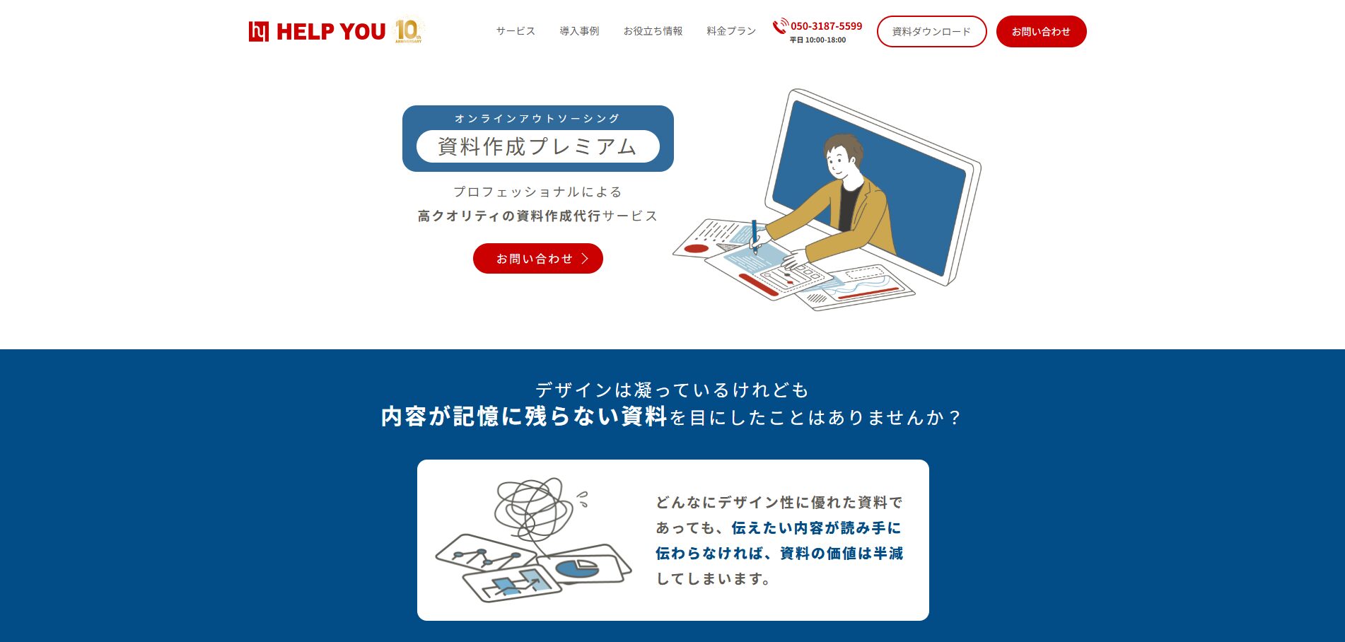 オンラインプレゼン最適化を得意領域として掲げ、原稿形式を問わずにスライド資料を外注できる資料作成サービス。専属コンサルタントがディレクションに入る点を特徴として打ち出しています。