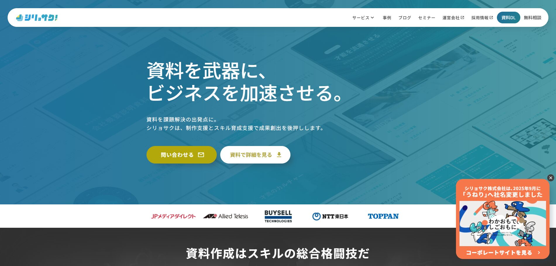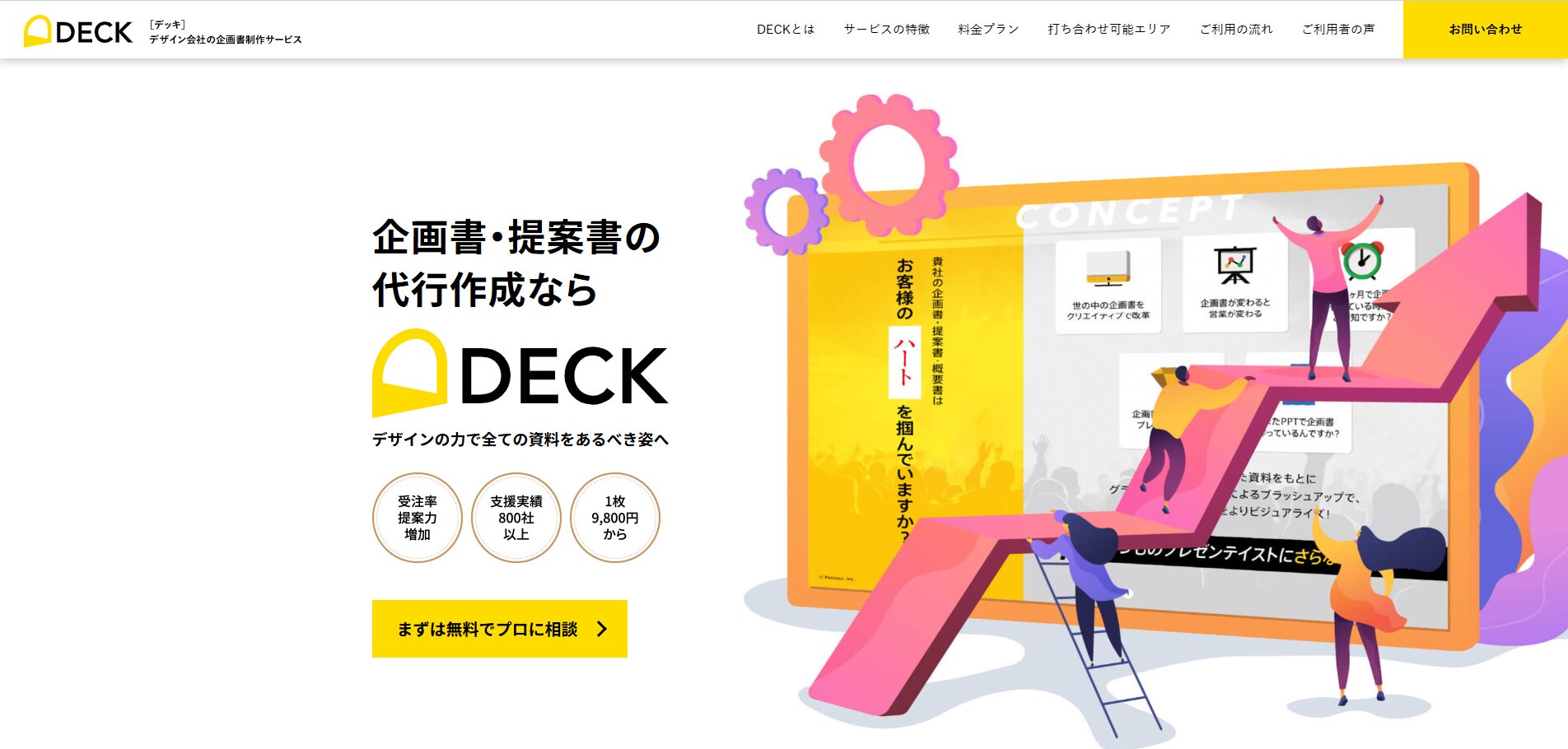 企画書・提案書に強みを置き、デザイン会社が“勝ちに行く”ことを目指した資料制作を代行するサービス。企画書/提案書の領域に寄せた訴求で、社内の資料作成負担削減も打ち出しています。