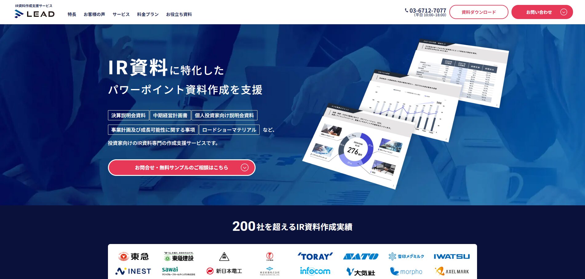 投資家向けのIR資料に特化したPowerPoint作成支援サービス。決算説明会資料・中期経営計画書・成長可能性に関する説明資料など、IR文脈の資料制作を専門領域として掲げています。
