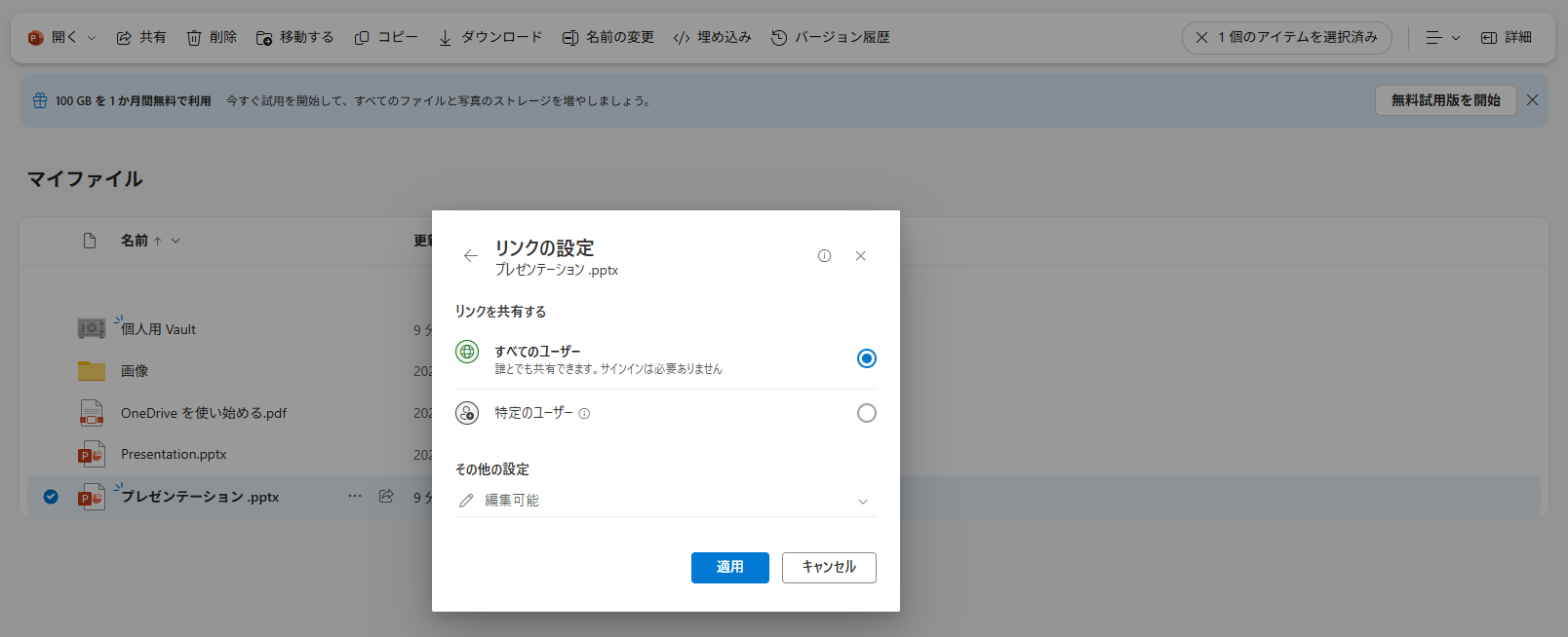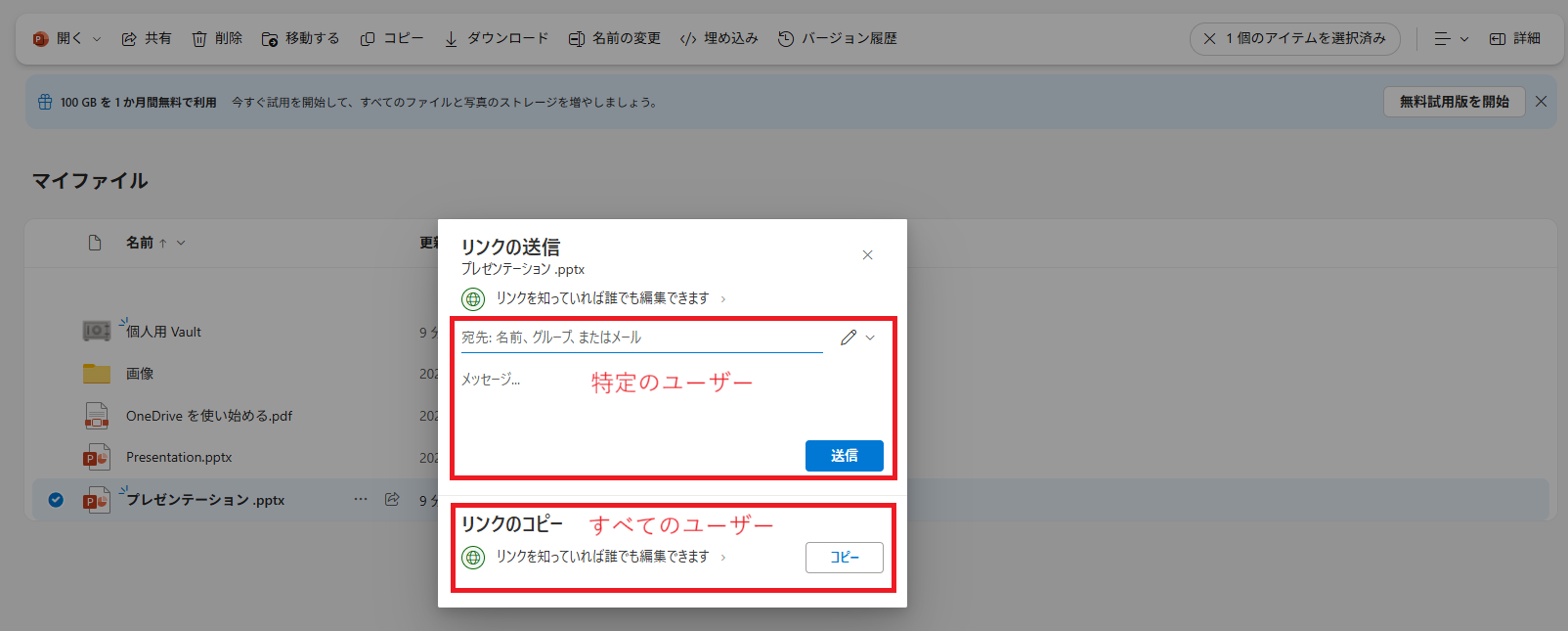 - リンクの設定で「すべてのユーザー」または「特定のユーザー」を選択する