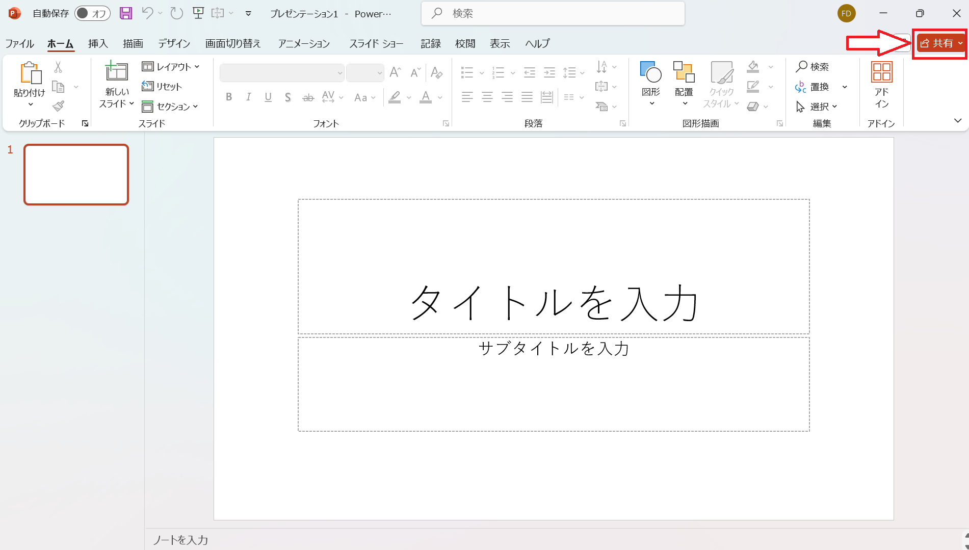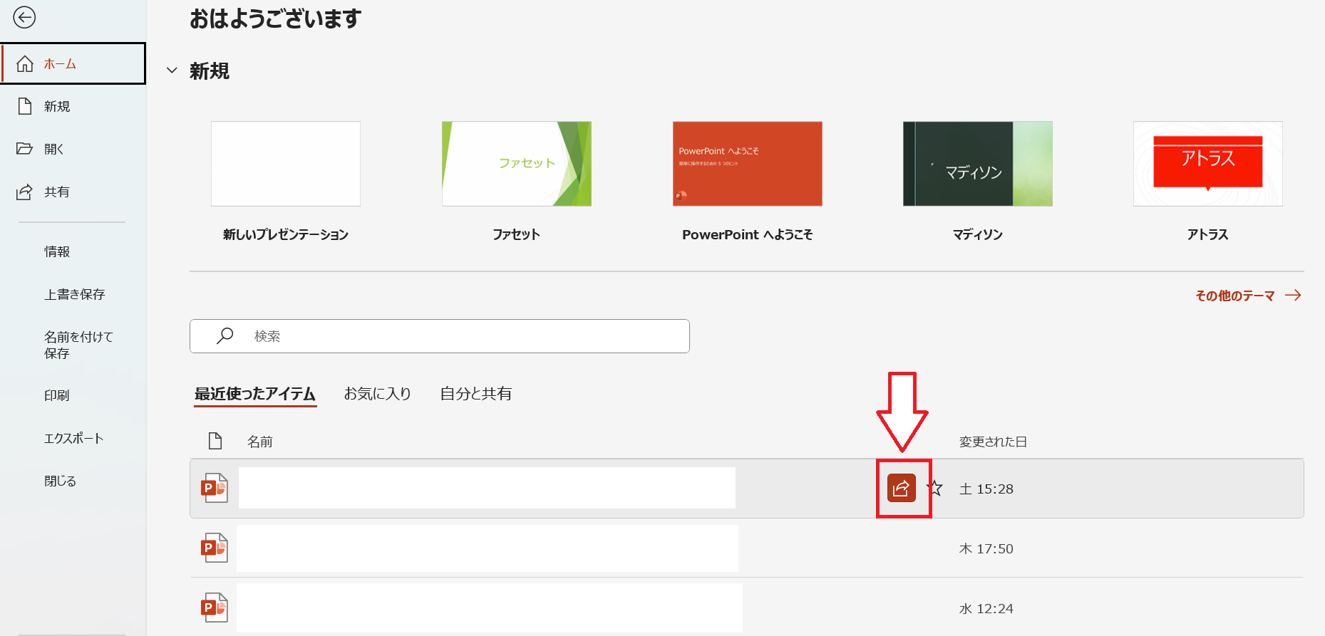 パワーポイントのソフトを立ち上げて、ホーム画面から共有することも可能です。