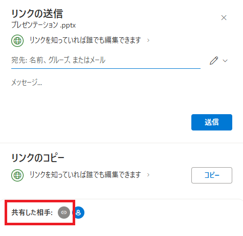 - リンクの送信画面下部の「共有した相手」からリンクマークをクリックする