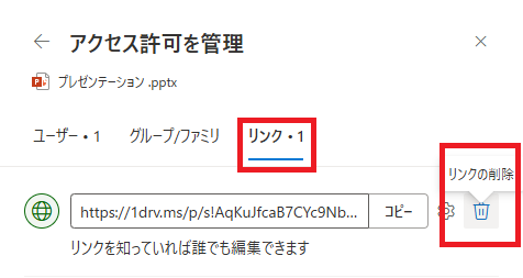 リンクを知っている全てのユーザーがアクセスできる状態で資料を共有した場合、共有しているリンク自体を削除することで共有を解除することが可能です。