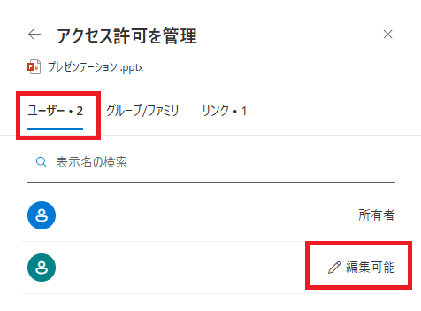 - アクセス許可の管理画面のユーザーから共有を停止したい相手をクリックする