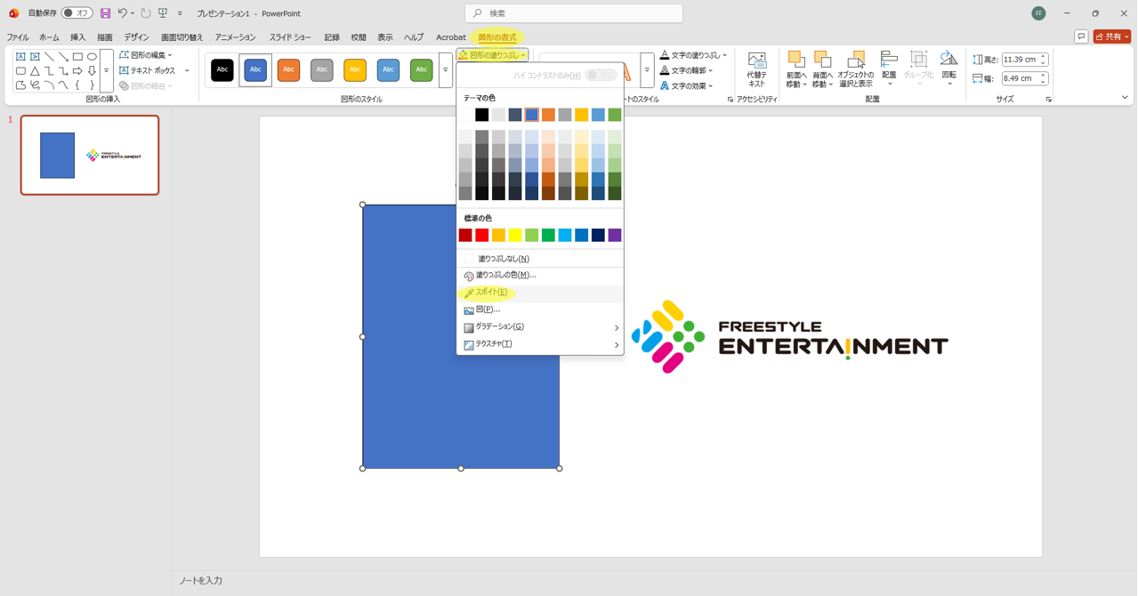 図形の塗りつぶし色を変更する際のスポイト機能の使い方は以下の通りです。