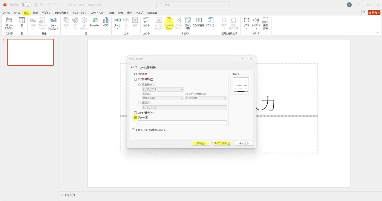 まず「挿入」タブから「ヘッダーとフッター」を選択します。表示されたダイアログボックスで「フッター」にチェックを入れ、出典情報を入力。特定のスライドのみに適用する場合は「適用」を、すべてのスライドに適用する場合は「すべてに適用」をクリックします。