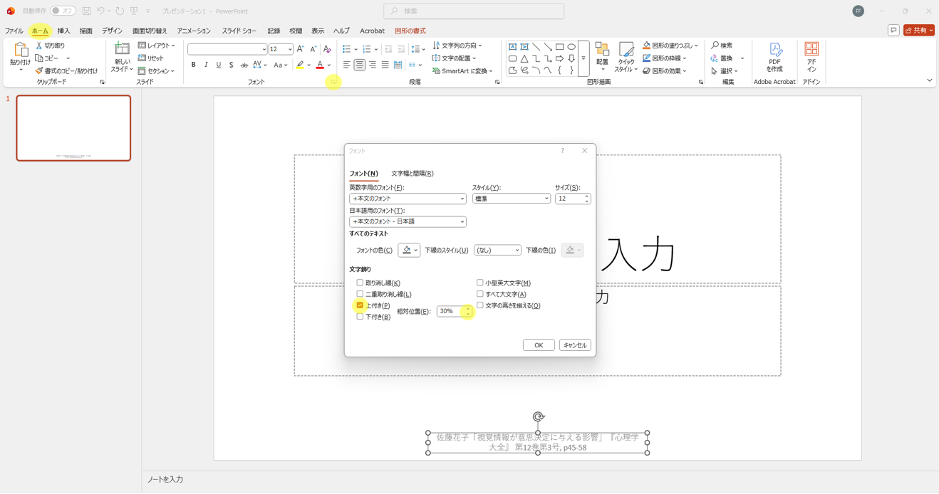フッター内に記載する参考文献番号には、上付き文字を設定すると見栄えが良くなります。番号を選択した状態で「ホーム」タブの「フォント」設定から「上付き」にチェックを入れ、相対位置を調整(30%程度)すれば、プロフェッショナルな仕上がりになります。