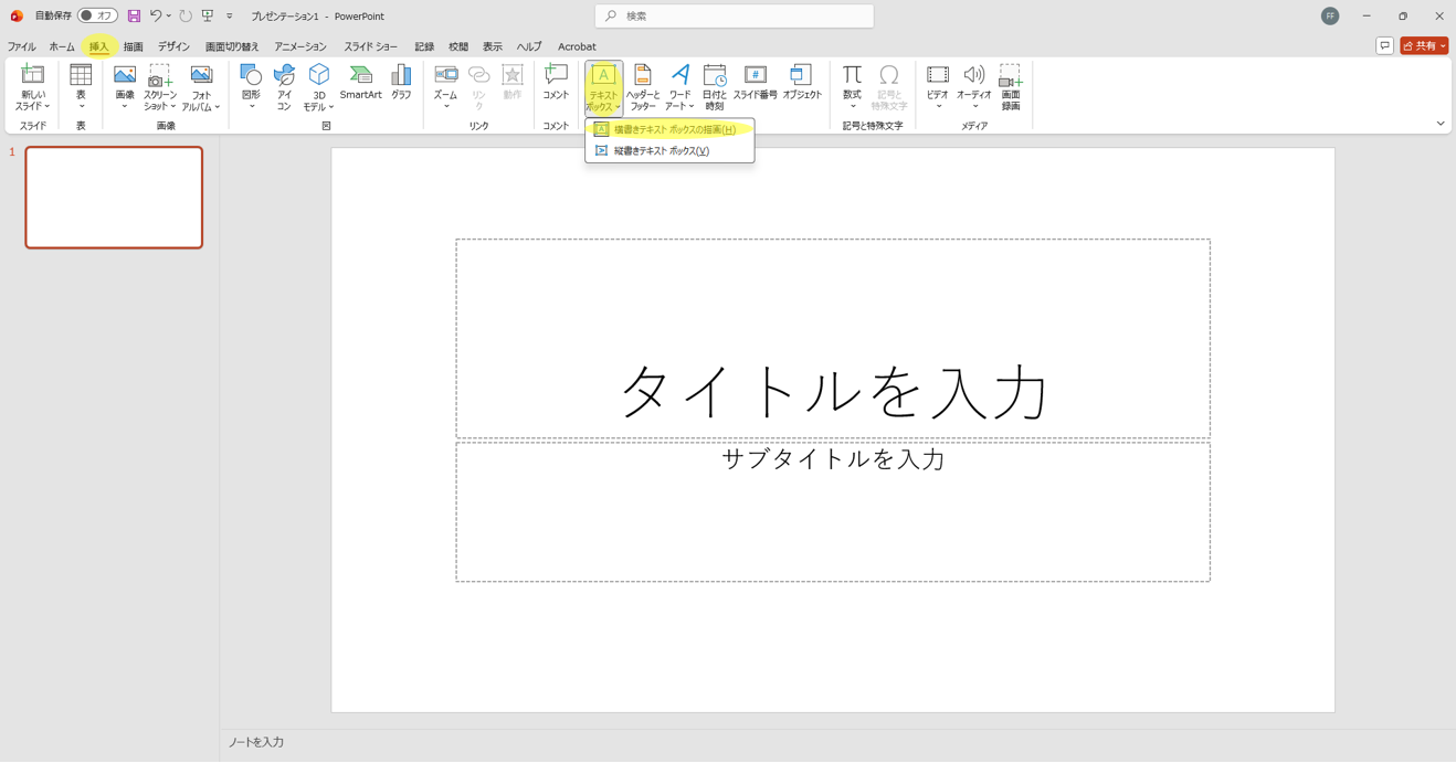 「挿入」タブから「テキストボックス」を選択し、「横書きテキストボックスの描画」をクリック。カーソルが十字に変わったら、出典を配置したい場所でクリックまたはドラッグしてテキストボックスを作成し、参考文献情報を入力します。