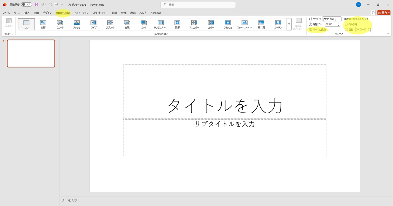 全てのスライドに同じタイミングを適用したい場合は、1枚のスライドで設定を完了した後、同じ「タイミング」グループ内の「すべてに適用」ボタンをクリックしてください。これにより、プレゼンテーション全体に同じ切り替え時間が設定されます。