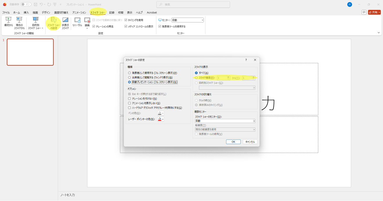 「スライドショーの設定」ダイアログボックスを開き、「スライドの表示」セクションにある「スライド指定」にチェックを入れます。その横の入力欄に、自動再生したいスライドの開始番号と終了番号を入力してください。