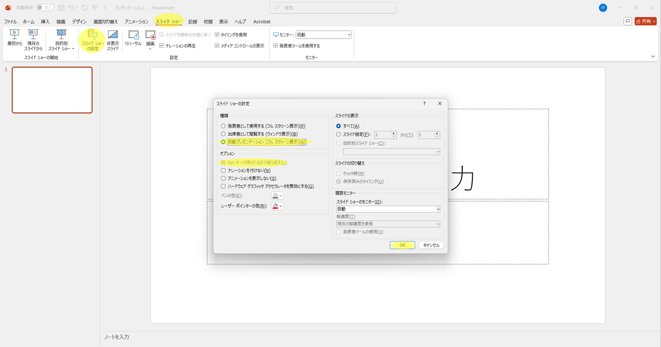 「自動プレゼンテーション」ではなく「発表者として使用する」を選択している場合は、別途「Escキーが押されるまで繰り返す」に手動でチェックを入れなければなりません。