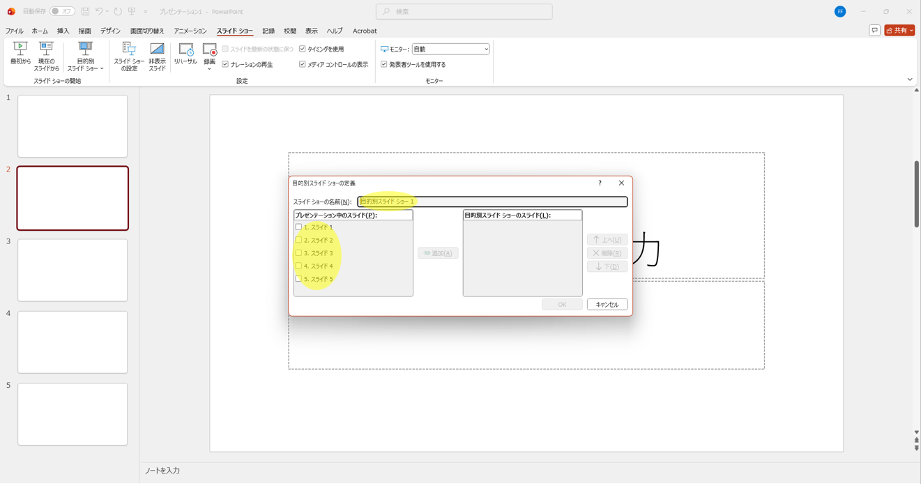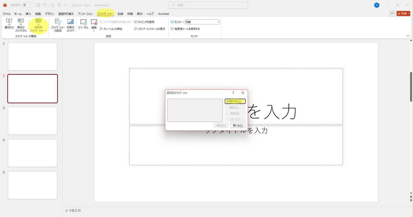 「スライドショー」タブから「目的別スライドショー」を選択し、「新規作成」をクリックします。表示されたダイアログボックスで、スライドショーに任意の名前を付け、自動再生で表示したいスライドにチェックを入れて「追加」をクリックしましょう。