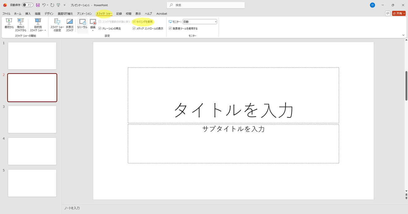 保存されたリハーサル時間で自動再生するには、「スライドショー」タブの「設定」グループにある「タイミングを使用」にチェックを入れた状態でスライドショーを開始します。