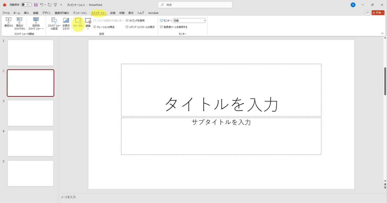 スライドごとに異なる表示時間を設定したい場合、リハーサル機能を使うと、実際のプレゼンテーションの流れに合わせた自然なタイミングで自動再生を設定できます。