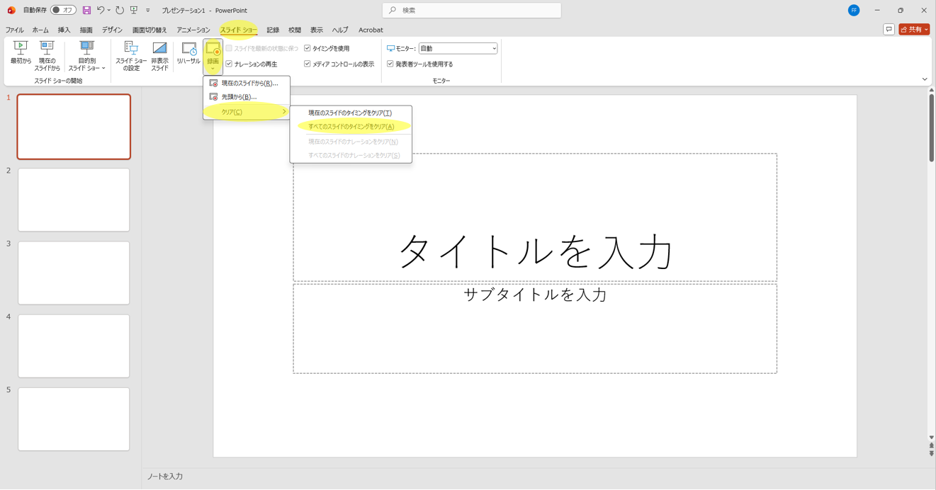 リハーサルで記録した時間を削除したい時は、「スライドショー」タブの「録画」から「クリア」を選択し、「すべてのスライドのタイミングをクリア」をクリックしてください。