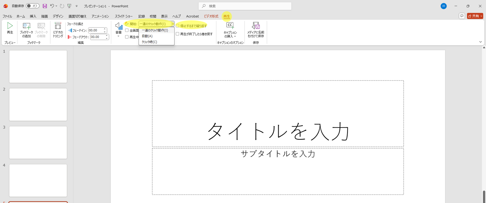 さらに、「停止するまで繰り返す」にチェックを入れれば、そのスライドが表示されている間、動画が繰り返し再生され続けます。店頭ディスプレイなど、同じ動画を何度も見せたい場合に有効な設定です。