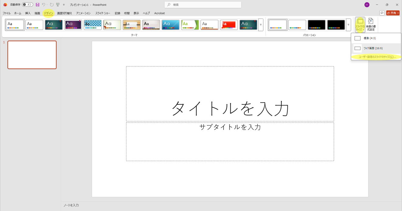 画面上部にある「デザイン」タブをクリックし、右側にある「スライドのサイズ」ボタンをクリックしてください。表示されるプルダウンメニューから「ユーザー設定のスライドのサイズ」を選択します。