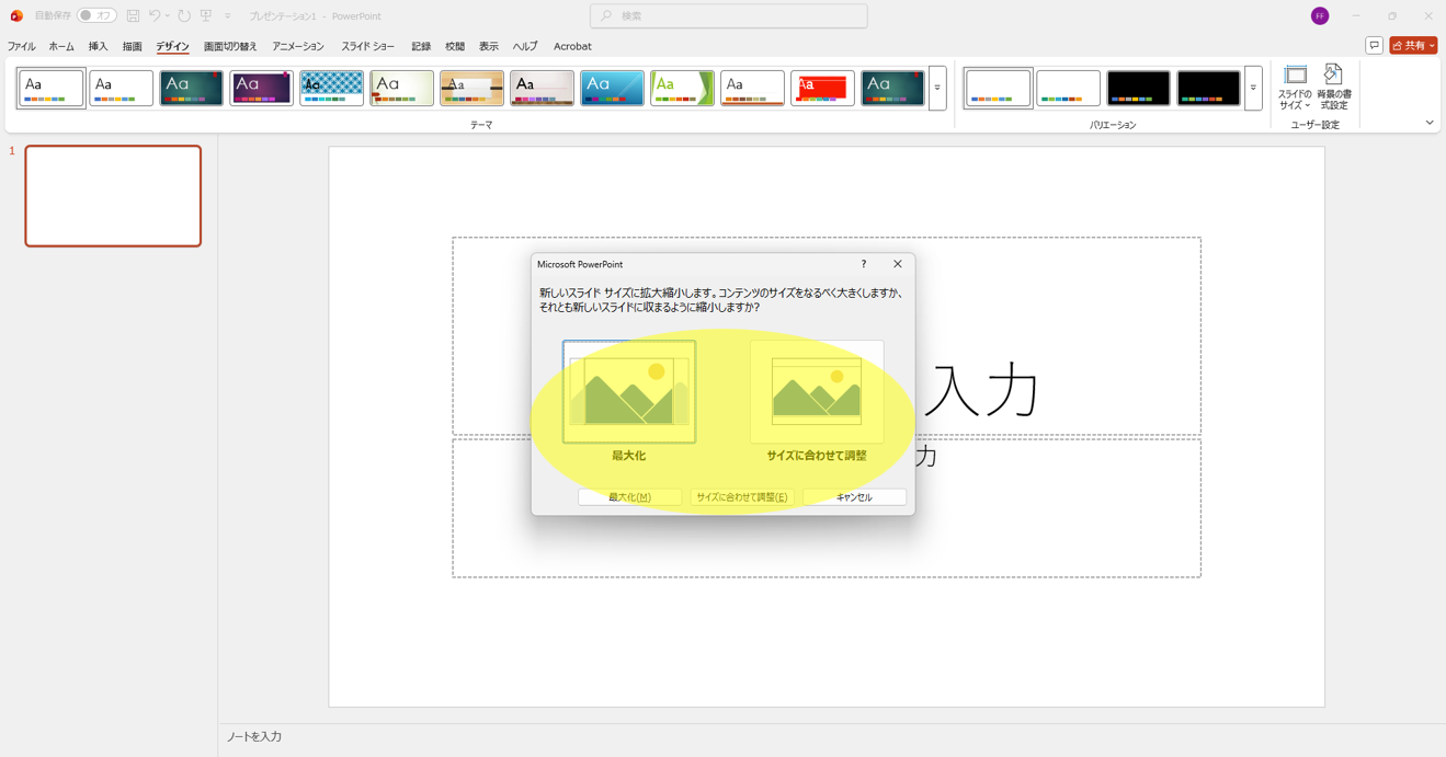 スライドの向きを縦に変更すると、「最大化」と「サイズに合わせて調整」のどちらかを選択する画面が表示されます。