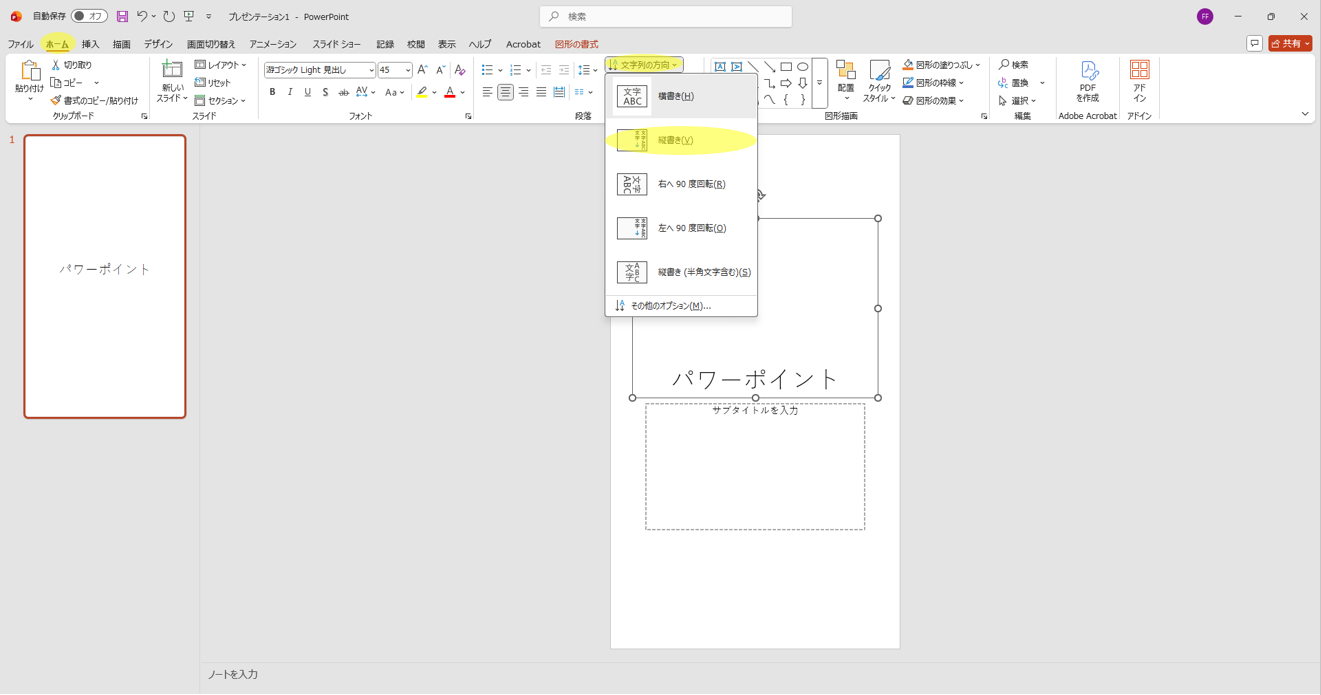 スライドを縦向きに設定しても、テキストは自動的に縦書きにはなりません。縦書きのテキストを入力したい場合は、別途設定が必要です。