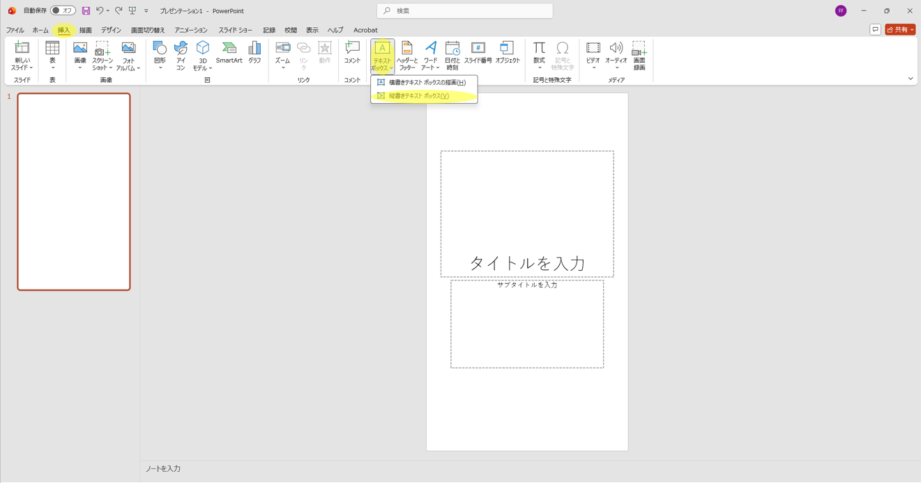 「挿入」タブを開き、「テキストボックス」ボタンをクリックします。プルダウンメニューから「縦書きテキストボックス」を選択すれば、縦書きでテキストを入力できるようになります。