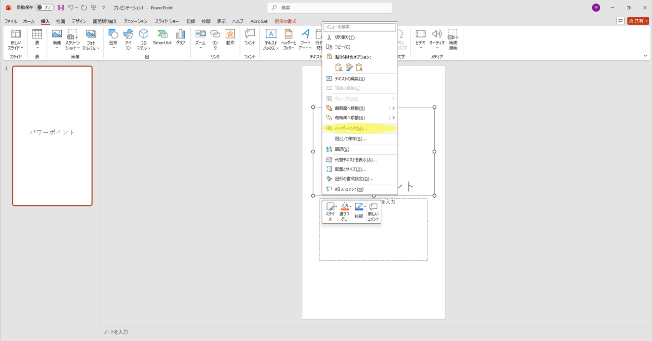 メインスライド内の任意のテキストや図形を選択し、右クリックして「ハイパーリンクの挿入」を選びます。リンク先にサブスライドのファイルを指定し、「OK」ボタンをクリックすれば設定完了です。