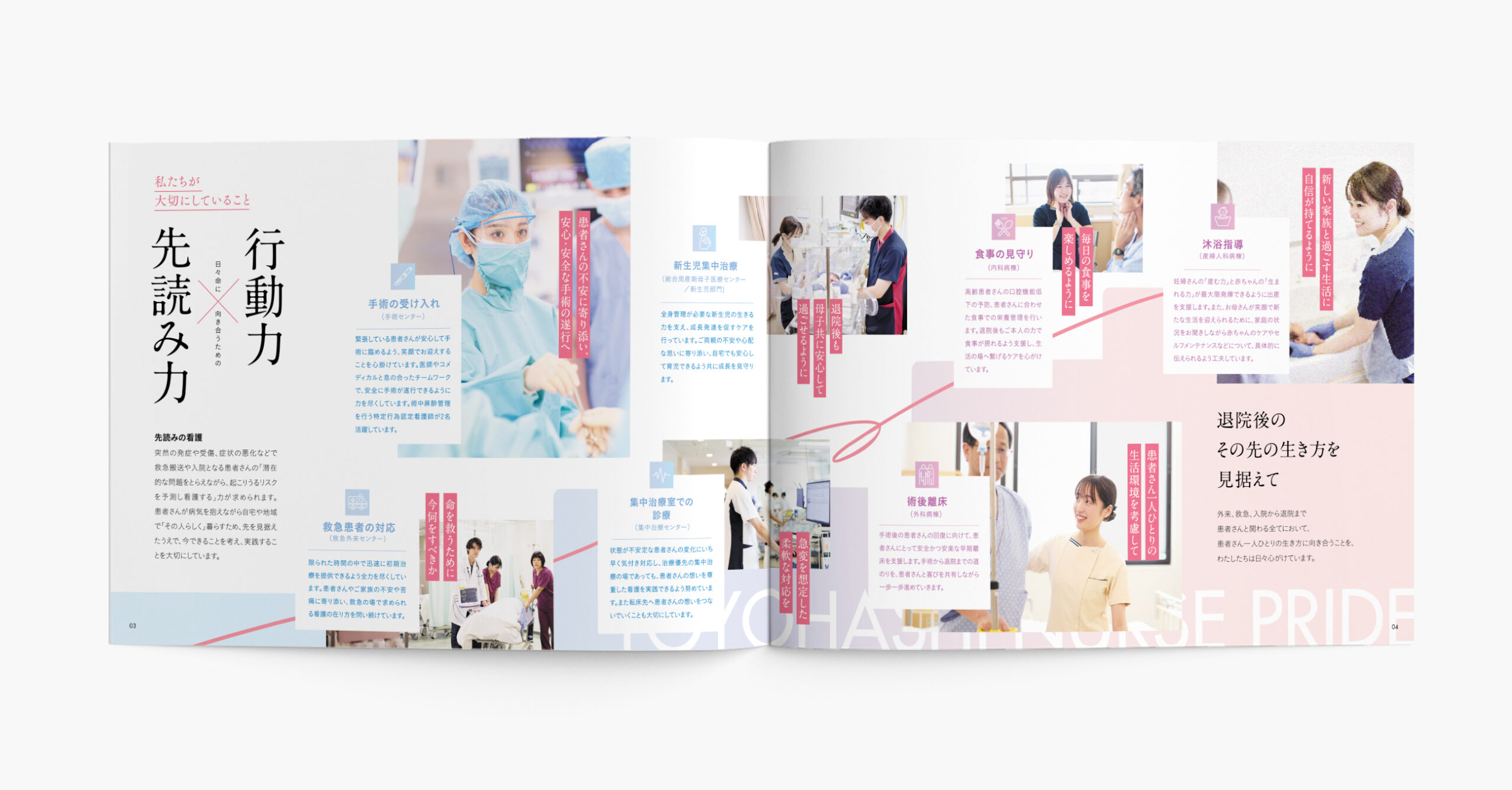研修医採用パンフレットは、豊富な症例数や整った教育体制だからこそ積み重ねられる経験や学び、成長を、重なり合う要素で表現しています。看護師採用パンフレットは、地域医療を担う総合病院で働く看護師としての、誇り高さを表現したシンプルなデザインとしました。